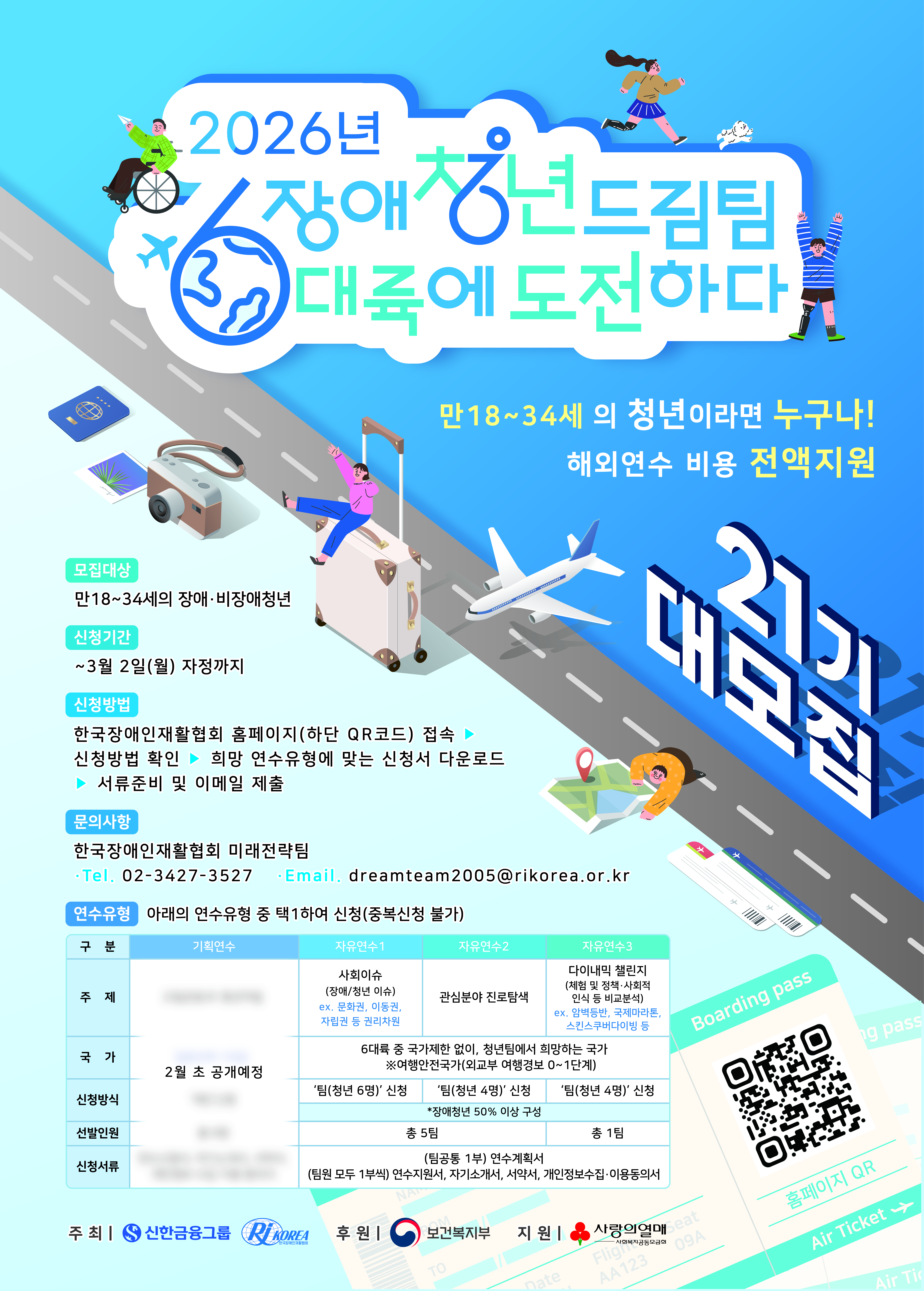 장애청년드림팀 21기 단원을 모집합니다. ■ 모집기간 : 2026년 3월 2일(월) 자정까지 ※기한 외 접수불가 ■ 신청자격 : 대한민국 국적의 만 18~34세 청년(2008~1991년생) ○ 우대사항 - 기초생활수급자 또는 차상위계층 - 자립준비청년 : 만 18세가 되어 아동복지시설 또는 위탁보호가 종료된 지 5년 이내인 청년 ○ 접수불가 - 모집기간 외 서류를 제출한 경우 - 제출해야하는 서류가 미비한 경우 - 여권발급불가 및 출국금지인 경우 - 당해 타 해외연수 프로그램을 참여하는 경우(연간 전 일정에 참여 불가한 경우) - 2023~2025년 장애청년드림팀 연수에 다녀온 경우 ■ 지원내용 ○ 국내 : 역량강화 교육, 워크샵, 후속활동 등 활동을 위한 식다과비, 지역간 교통비 등 전액 ○ 국외 : 해외연수(항공 및 숙박, 식다과 및 교통, 문화체험, 보험 등 체류비 전액) ※단, 여권 및 비자발급비/로밍 및 개인선물비의 경우 제외 ■ 모집유형 : 총 4유형 ※중복신청 불가 ☞ 연수유형 기본이해 - 기획연수 : 전문가 연수단장과 사무국 주도하에 연수내용을 설계하여 관련분야에 성장욕구가 있는 청년들을 '개별적'으로 선발하여 전문적 성장을 지원하는 연수(총 1개팀(6명 개별) 모집)